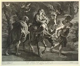 Flight into Egypt is a 1658 oil painting by Juan de Pareja.[1] The painting, now housed in the Ringling Museum of Art in Sarasota, Florida, was the first of Pareja's works to enter the United States after being acquired by the Ringling brothers in the 1920s. The painting is one of many paintings on religious subjects among Pareja's surviving works. Pareja's authorship is confirmed by his signature and the date inscribed on the rock towards the lower left of the canvas, identifying it as his earliest known work to date. The work marks Pareja's transition from an enslaved assistant in artist Diego Velázquez's studio to an independent artist. Its bright color palette, structured composition, and religious symbolism reveal its fusion of both Spanish and Venetian artistic traditions.[2]