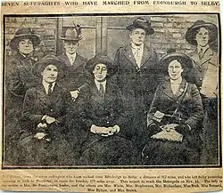 Fonblanque decided to mount a march from Edinburgh to London to draw attention to the women's suffrage cause. She initially thought that walking to Edinburgh would be a good idea but it was decided to march from Edinburgh so that the march could end its publicity in London.[1] Only six women including Agnes Brown[3] and Sarah Benett, who was the Treasurer of the Women's Freedom League set off on 21 October 1912.[4] Fonblanque's sister and Ruth Cavendish Bentinck helped with the organisation.[5] As they and Fonblanque traveled from Scotland to London they gathered signatures on a petition and coverage in the newspapers.[6] Fonblanque ensure that they were dressed in brown with rosettes and bright green cockades[7] and they were known as the "Brown Women". They followed the route of the A1 and they were joined by dignitaries along the way. On one day near Berwick they walked over 30 miles before the now seven marchers were welcomed by the local member of parliament. Their numbers swelled slowly - when they passed through Grantham in November there were twelve walkers including Fonblanque.[4]