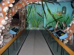 This gallery features a 12-times life-size underwater scene to explore the tiny organisms that sustain the estuary. Large sculptures of plants, fish, and invertebrates surround the walkway, and shimmering underwater light adds a sense of reality to the scene.
