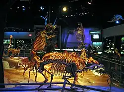 The entrance to the hall showcases six fossil shark jaws, ranging in height from 2–9 feet. The exhibition begins with five extinction events described in dioramas that lead visitors onto the Florida Platform at about 66 million years ago, also known as the Dawn of the Age of Mammals. Displays include a primitive-toothed whale in the Eocene, a pig-like, extinct mammal from the Oligocene, a Miocene rhinoceros being attacked by two saber-toothed, cat-like animals, a 15-foot (4.6 m)-tall sloth standing on its hind legs in the Pliocene area and a 500,000-year-old jaguar chasing a peccary from the Pleistocene epoch. The time periods also include artwork by paleoartists from around the world, including a 9-foot (2.7 m)-tall steel sculpture of an extinct Terror Bird, Titanis walleri.[11]