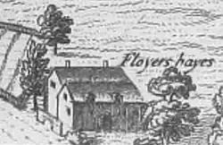 No remains of the manor house survived beyond about 1830 or 1840. It stood set back a little way on the east side of the road from Exeter to Alphington, between the Haven Road and the railway viaduct, rather beyond what was known in 1898 as Sydney Place.[4] The name "Flower Pot Buildings" may have been originally "Floyer's Plot." The land lies very low, and was intersected by streams by which mills are worked. A mill is mentioned as being on the manor of Floyer's Hayes in the time of Henry III (1216–1272). Many open spaces around the outside of the City walls are shown on the 1765 map of Exeter by Benjamin Donnas as suffixed "Hay", such as Shill Hay, Southern Hay, Northern Hay, Fryers Hay and Bon Hay. The manor house is shown on a 1573 map of Exeter[5] as a building of large size, surrounded by a stone wall and entered beneath a large arched gateway.[4] According to Worthy (1892), though mistaken: "It stood nearly in a line with "Snayle Tower", and on the west side of the river, and must have been very near the ancient priory of Cowick, but a little to the south-west of it". However, this was another large house, 'Hays Barton'. Worthy's assumption that near to that had stood the ancient priory, was also in error, since that had stood above the 50-foot contour beyond what is today 'Cowick Playing Fields' at Cowick Barton.