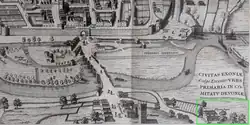 Floyer Hayes shown (bottom right) on 1617 map of the City of Exeter in the 6th volume of Civitates Orbis Terrarum by Georg Braun (1541-1622). St Thomas's Church at left (west)