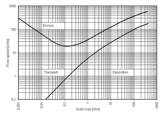 Hjulström curve: the velocities of currents required for erosion, transportation, and deposition (sedimentation) of sediment particles of different sizes