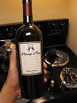Folie à Deux currently makes Cabernet Sauvignon, Pinot Noir, Zinfandel, Merlot, Chardonnay, and Sauvignon blanc. The winery also produces three wine blends and four varietals under the name Menage à Trois.[3] Menage à Trois Red was the top selling red wine product in the United States as of 2010.[4] The Menage à Trois brand sold 1.6 million cases in 2009,[5] and Menage à Trois was named the "Wine Brand of the Year" by the beverage industry publication Market Watch.[6]