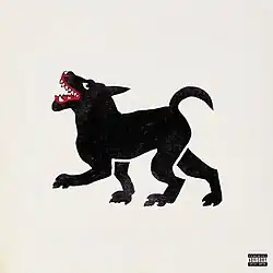 The artwork for For All the Dogs was revealed in August 2023 on an Instagram post, with the album title and "Cover by Adonis" as its caption, meaning that it was drawn by Drake's son Adonis.[12] It shows a white dog with evil red eyes standing straight in front of a black background, with a Parental Advisory label on the bottom-right corner.[44] Adonis described his artwork as "a carefree piece of work". Drake called the work "an inspiration to his 2016 album Views". Drake dedicated the artwork to his 5th grade artwork which shows a cat with blue eyes.[45]