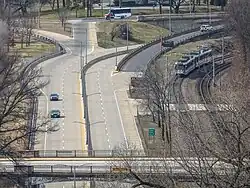 A MetroLink train passes next to Forest Park Parkway within Forest Park