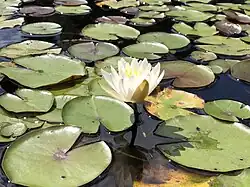 This plant is rooted from branched rhizomes that gives rise to long petioles that terminate in smooth floating leaves. Since the leaves are subject to tearing by water and waves, they are round with a waxy upper coating that is water-repellent.[13] The flowers also float. They are radially symmetric with prominent yellow stamens and many white petals. The flowers open each day and close again each night and are very fragrant. Once the flowers are pollinated, the developing fruit is pulled back under water for maturation.[14]