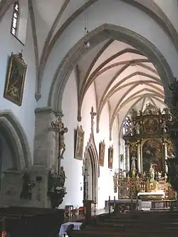 The presbytery is separated from the nave by a triumphal Gothic arch. Late Gothic scenes from the life of St. Barbara from after 1460 can still be found on the walls and the vaults.