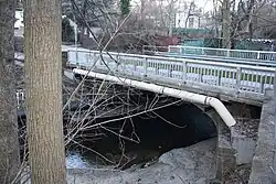 In 1949, the creek's path through Frankford was straightened as two horseshoe bends were removed in the vicinity of the intersection of Wyoming and Castor Avenues. An arch structure, the remains of a bridge carrying Wyoming Avenue over one of the removed bends in the creek, is visible from park level (approximately 15 ft (5m) below Wyoming Ave.). A bridge railing along the sidewalk still exists in this location, across from Eastern Regional Medical Center of Cancer Treatment Centers of America (formerly Parkview Hospital). Downstream from Castor Avenue, the creek now flows through a concrete culvert.