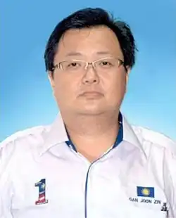 Frankie Gan Joon Zin (颜骏任; born 16 July 1966) is a Malaysian politician and a member of the Malaysian Chinese Association (MCA), a major component party in the Barisan Nasional (BN) coalition. He is also a community leader in Bukit Bintang, Kuala Lumpur.