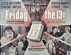 Friday the Thirteenth is a 1933 British drama film directed by Victor Saville and starring Jessie Matthews, Sonnie Hale and Muriel Aked.[1]