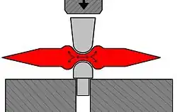 In bladesmithing, fullers are often used in pairs. The upper fuller has a flat surface for striking with a hammer, while the lower fuller has a square peg that fits into the anvil. The fullers displace material in the blade, causing it to move sideways and bulge outward from the surface.