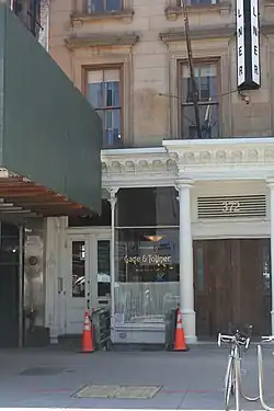 Only the northern elevation of the facade, facing Fulton Street, is visible.[178][179] The wooden ground-level storefront was likely added when the restaurant moved into the building and is designed in the Neo-Grec style.[178][75] At the center of the storefront are a pair of Doric columns which support a slightly projecting portico. To the left is a double door and a window, while to the right is another door; they are separated by colonettes, which in turn are topped by capitals with foliate decoration. These support a frieze with alternating eight-pointed stars and decorative brackets. A cornice runs horizontally above the facade.[178][179]
