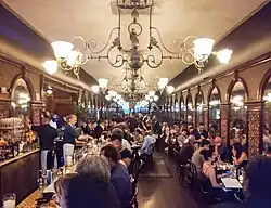 The interior retains its original Victorian design.[178] Rather than emphasizing elegant design, the restaurant's original architect(s) wanted to make the space appear comfortable through the quality of the workmanship, such as mirrors and woodwork furnishings.[75] In particular, the main dining room was intended to resemble the interior of a railcar.[105][183] By the 1990s, the first floor had a total capacity of 110 people, while another 70 people could fit on the second floor.[10] As of 2021, the main dining room seats 70 people, while the bar has 40 seats.[162]