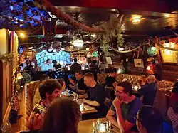 On the second floor is the Sunken Harbor Club, a cocktail lounge themed to a tiki bar.[195][161] It was designed in a Victorian style and contains flags, maps, rattan furniture, and wooden paneling.[162] When the lounge opened in 2021, a friend of the restaurant's owners painted a mural within the bar.[196] In addition, there are glass fishing trawlers and fish mounted onto various surfaces.[173] A dumbwaiter connects the second floor with the ground-level kitchen.[70]