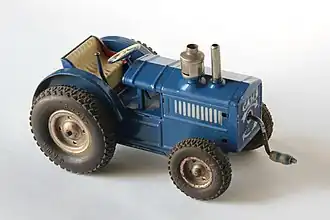 Gama also made tin friction and plastic cars through the 1960s, like the 1950s Auto Union look-alike which was not very clever in form – having a 'flattened' driver stamped into the metal. Later tinplate vehicles like the 1950s Cadillac and Aston Martin were fairly accurate compared to the real cars. Trucks and motorcycles were also made – usually around 10 inches long, but many were smaller. One example made around 1950 was a 6 inch long motorcycle ridden by a chimp in a circus suit. Many were wind-up/clockwork in operation. Other more traditional toys, like a donkey ridden by a clown – or more fantastical, like spaceships, were also produced.