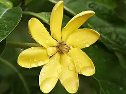 Gardenia tubifera, also called golden gardenia, is a species of flowering small tree in the family Rubiaceae, native to Asia. It is a small tree, growing to a height of 2–4 m (6–12 ft) high with a spread of 1–2 m (3–6 ft). It prefers tropical conditions and will not tolerate temperatures below freezing.