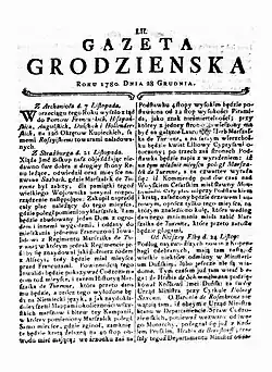 Gazeta Grodzieńska was a weekly Polish language newspaper published in Grodno, Polish–Lithuanian Commonwealth. It was first published in 1776 and lasted till 1783. It covered news about the Commonwealth.[1][2]