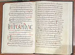The book exists in several manuscripts, the oldest of which is an 8th-century manuscript in the Vatican Library, acquired from the library of Queen Christina of Sweden (thus MS Reginensis 316); in German scholarship this is referred to as the Altgelasianum, and is considered the sacramentary used by Saint Boniface in his mid-8th century mission on the European continent.[1] This is the most important surviving Merovingian illuminated manuscript, and shows a synthesis of Late Antique conventions with "barbarian" migration period art motifs comparable to the better known insular art of Britain and Ireland.