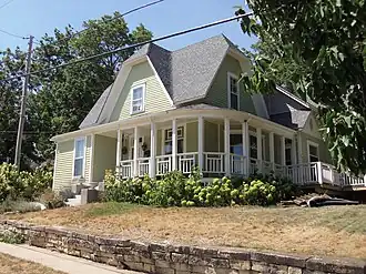 The George Tromley Jr. House is a 1½-story frame structure that was built in 1865. The house is noteworthy because of its use of the jerkinhead gable roof with a large jerkinhead dormer centered on the main facade.[2] This makes it among the more picturesque houses found in Le Claire.[4] The exterior is faced with narrow clapboards. There is a one-story porch that curves around the southeast corner of the house and it connects with a one-story, gable-roofed section on the northeast corner. This section may have been used as a summer kitchen. The house is located on a raised lot that is surrounded by a stone retaining wall.