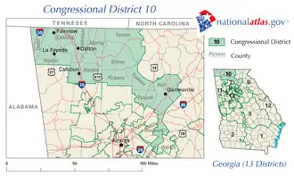 Georgia's 10th congressional district is a congressional district in the U.S. state of Georgia. The district is currently represented by Republican Mike Collins, and includes a large swath of urban and rural territory between Atlanta and Augusta.