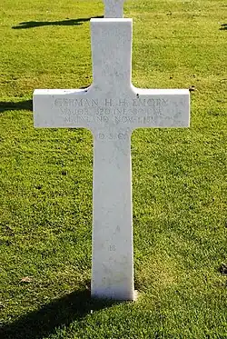 Originally Major Emory was buried in a little courtyard in the demolished town of St. Juvin, a small wooden cross with his name, rank, regiment and date of death marking his resting place. At the time of his death he was just 36 years old. Later his body was moved and re-interred at the Meuse-Argonne American Cemetery and Memorial (also known as the Argonne American Cemetery), along with 14,245 other American comrades from the American Expeditionary Forces (AEF).[27] Most lost their lives during the Meuse-Argonne Offensive, which was the largest battle in American military history, involving 1.2 million American troops and was the principal engagement of the United States in WW 1. It lasted from September 26 to the Armistice with Germany on November 11, 1918.
