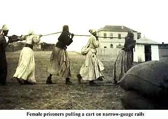 The neighbouring British objected to what they regarded as the inhumane German policy. This involved maintaining a number of concentration camps in the colony during their war against the Herero and Nama peoples. Besides these camps, the indigenous people were interned in other places. These included private businesses and government projects,[12] ships offshore,[13][14][15] Etappenkommando in charge of supplies of prisoners to companies, private persons, etc., as well as any other materials. Concentration camps implies poor sanitation and a population density that would imply disease.[16] Prisoners were used as slave labourers in mines and railways, for use by the military or settlers.[17][18][19]