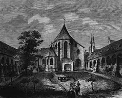 The museum constitutes an architectural monument in itself, as it consists of a variety of buildings erected in different periods. It incorporates the remaining structures of the former Nuremberg Charterhouse (German: Kartäuserkloster), dissolved in 1525 and thereafter used for a variety of secular purposes until in 1857 what was left of these premises, by then badly dilapidated, was given to the museum. The charterhouse was rebuilt and modified to accommodate the collections until the late nineteenth century when Neo-Gothic extensions were added on its south side. During and after the First World War, the "Alter Eingang" (Old Entrance) and the "Galeriebau" (Gallery building) designed by German Bestelmeyer were built to provide an entrance from Kornmarkt and further space.[3]