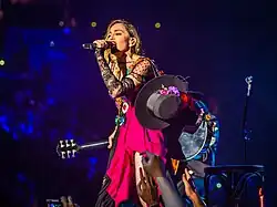 "Ghosttown" had been initially absent from the 2015–2016 Rebel Heart Tour. However, on the September 19, 2015, stop at Brooklyn's Barclays Center, Madonna announced that she would perform the song but it was unrehearsed. "That is the truth. So, if I make mistakes, will you forgive me?", she added and sang an acoustic version. According to Robbie Daw from Idolator the performance received positive response from the audience.[108] Slant Magazine's Sal Cinquemani described it as a "stirring, if pitchy, rendition of [the] shoulda-been-a-sleeper-hit... which brought seemingly genuine tears to [Madonna's] eyes, a development that seemed to surprise even her".[109] On July 27, 2017, Madonna performed "Ghosttown" at Leonardo DiCaprio's annual fundraising gala in Saint-Tropez, France.[110]