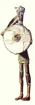There is no longer any dispute about the authenticity and Nuragic manufacture of the three statue-baetyls discovered in northern Sardinia, a region where a Corsican population of Nuragic culture was probably settled. At first the three statues were considered to be Punic or Roman artefacts,[28] but these sculptures evidently portray warriors with an envelope-shaped, crested and horned nuragic helmet – as also suggested by the crest and by the circular cavities that probably held the horns (these latter still present in the statue-baetyl from Bulzi, Sassari).[29][30]