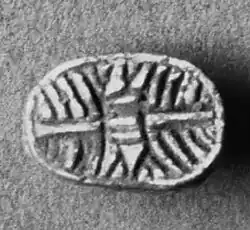 Still in the time-frame of the Prenuragic age, but in this case during the Eneolithic period, there is a remarkable production of "Laconi-type" statue-menhirs or statue-stelae, assigned to the Abealzu-Filigosa culture and characterized by a uniform tripartite scheme encompassing, from top to bottom: a stylized T-shaped human face; the depiction of the enigmatic capovolto (the capsized) in the kind of trident capovolto; and a double-headed dagger in relief.[11][20]
