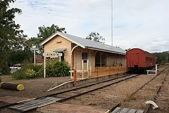 From 1 November 1960 the Mount Perry railway was closed beyond Tirroan, due to declining revenue. The railway beyond Tirroan was dismantled in 1961. After the transfer of sugar cane traffic from the Watawa plantation area in 1964, to the Gin Gin Central Sugar Mill at Wallaville there was little traffic beyond Gin Gin other than stock specials to the cattle loading railhead at Tirroan. The section of line from Tirroan to Mount Perry was closed in 1960 and removed in 1961, due to declining traffic revenues. The Gin Gin to Tirroan section was closed in 1989. The final section of the Bundaberg Railway, beyond the Versatile Toft siding (North Bundaberg to Gin Gin), closed officially to traffic on 25 January 1993, although services had been suspended in 1991. The line was sold for removal, with rail being sold off to local sugar mills for use on their tram networks. Part of the former right-of-way has been adapted for use by the Bingera Mill for its sugar tramway. The Gin Gin station complex was leased to the Gin Gin and District Historical Society in 1993, following closure of the railway. The complex was purchased by the Kolan Shire Council in 1995 for the use of the Historical Society. Other buildings have been transported on to the site by the Gin Gin and District Historical Society including a school house, and police residence, barn and indigenous museum (housed within the former goods shed). The additional buildings have not been relocated to the immediate vicinity of the former railway yard, and as a result do not detract from the visual appeal of the railway complex Within the former station yard the trackwork, turnouts and roads have been retained extant. Donated items from Queensland Railways including a BBV guards van, camp wagon, and a flat wagon and water gin, which have been placed on the platform road at the station building, and other roads within the complex. At the Tirroan end of the complex a former Gin Gin Central Sugar Mill tramway 0-6-0 steam locomotive has been placed on display on a dual-gauge 1,067-and-670-millimetre (42.0 and 26.4 in) track.[1]