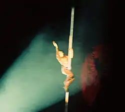 Madonna and Ciccone decided to work with five different choreographers, one of them being American actor Gene Kelly, whom the singer wanted to choreograph the performance of single "Rain".[18] However, tension soon arose as Kelly was uncomfortable with the dancers; he believed they had been selected based on personality rather than for their abilities as dancers. He also wasn't too fond of the show's "heavy sexual overtones", according to Ciccone.[18] Feeling Kelly's position wasn't working out, Ciccone convinced the singer to fire him; eventually, Madonna, "shamefaced at having single-handedly conceived of such a terrible fate for this venerable American icon", agreed with her brother and dismissed Kelly.[18] Alex Magno was then appointed one of the Girlie Show's main choreographers.[19] For the show's main theme, Madonna and her brother agreed on a "burlesque circus" and, for inspiration, would watch Bollywood films, Thai dance numbers, Carol Reed's Trapeze (1956), as well as the work of Marlene Dietrich, Louise Brooks, Erté, and Zizi Jeanmaire.[18] Like Blond Ambition, the Girlie Show was divided into four different thematic acts: Dominatrix, Studio 54, Weimar Cabaret, and an encore.[20]