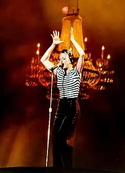 "Like a Virgin" opened the Weimar Cabaret segment: Madonna wore top hat and a tailcoat while singing in the guise of actress Marlene Dietrich, pronouncing the word "virgin" as "wirgin".[38][39][40] "Bye Bye Baby" saw Madonna, Haris, and De Lory performing with three scantily clad women in a choreographed, highly sexual routine.[41] "I'm Going Bananas" was then sung in "Judy Holliday/Betty Boop/Cyndi Lauper-ish vocals."[38] For the next number, "La Isla Bonita", Madonna removed the tailcoat, and performed in a blue and white striped shirt. She sang on top of a rising platform while one of the musicians walked around bare-chested playing the acoustic guitar.[32][37] The final song before the encore was "Holiday"; it featured Madonna and the dancers wearing long trenchcoats and doing a military parade while an American flag was hung in the background.[38][42] The final numbers were "Justify My Love" and a mashup of Sly and the Family Stone's "Everybody Is a Star" (1969) and Madonna's own "Everybody":[37] the former had the singer and dancers wearing Victorian costumes and her holding a lorgnette, and the latter saw them change into white tops and denim shorts.[38] Afterwards, as a red curtain fell and carnival music played, the pierrot emerged yet again, only to reveal its identity as Madonna herself. The singer closed the show by singing the phrase "Everybody is a Star" as the curtain fell once again.[32]