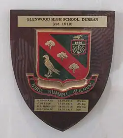 In 1915 South Africa sent one brigade of Infantry to support the Allied war effort on the Western Front. The 1st South African Infantry Brigade comprised four battalions with the 2nd Battalion being known as the Natal & OFS Battalion, containing many men from Durban and Pietermaritzburg.[6] In 1915, there were only 120 boys at the school,[7] of which (from the Class of 1914 and earlier) twenty five ex-Glenwood pupils lost their lives as part of this Battalion during World War I.[8] Of those killed, four were killed during the Battle of Delville Wood.
