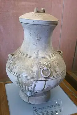 The Minister Coachman (Taipu 太僕), also known as the Grand Coachman, was responsible for the maintenance of imperial stables, horses, carriages and coachhouses for the emperor and his palace attendants, and for the supply of horses for the armed forces.[87] His latter duty entailed the supervising of large breeding grounds of frontier pastures, tended by tens of thousands of government slaves.[88] By the reign of Emperor Wu of Han (r. 141–87 BC) these contained 300,000 warhorses intended for use in campaigns against the nomadic Xiongnu Confederation.[89] Some of the Minister Coachman's subordinates managed stables outside the capital city. These stables housed Ferghana horses that were imported or gathered as tribute from Central Asian countries.[90]