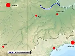The Grana del Monferrato (to distinguish it from the Grana of the Province of Cuneo) is a small Italian river, classified as a torrente, a right tributary of the Po, which runs almost entirely in the Province of Alessandria among the hills of the Basso Monferrato which lie between the Po to the north and the Tanaro to the south. Notwithstanding its modest flow, it is the most significant Po tributary of the Basso Monferrato in terms of its length, the extent of its drainage basin and its discharge.