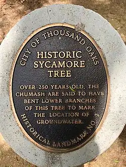 On the museum grounds, near the Tri-Village Complex, is a historic 250+ year old sycamore tree. The tree was designated Ventura County Landmark No. 44 in June 1978, due to its "great age, size, and formation."[17] The tree is also designated Thousand Oaks City Landmark No. 2.[21] Furthermore, General John C. Frémont passed by this tree in 1846 on his way to sign a treaty with General Andrés Pico to secure California's annexation to the U.S.[22] The Chumash Indians are said to have bent the lower branches to mark the location of underground water.[23]