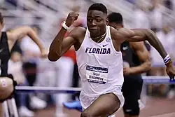 He was one of the most versatile athletes in the NCAA, setting personal bests of 6.50 s in the 60 m dash, 12.98 s in the 110 m hurdles, 8.17 m in the long jump, and a 43.75 s split in the 4 × 400 m relay while competing for the Florida Gators. He holds the NCAA and American record in the 60 m hurdles with a time of 7.35 s, set at the NCAA Division I Indoor Championships. This mark also made him the third-fastest man in the event in history.[12][25][13] His NCAA record of 12.98 s in the 110 m hurdles, set at the NCAA Division I Championships, broke 40-year-old record held by former world record holder Renaldo Nehemiah.[26] He was a member of the championship and record breaking 4 × 100 m relay team at this championships, which clocked the first sub-38 relay in NCAA history with a time of 37.97 s.[27]