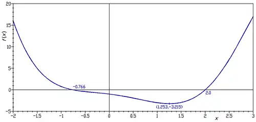 Graph of the function over the interval [−2,+3]. Also shown are the two real roots and the local minimum that are in the interval.