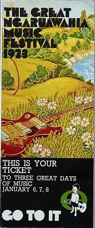 The Great Ngaruawahia Music Festival was the first large outdoor music festival in New Zealand. It was held on a farm at Ngāruawāhia on the Waikato River, 19 kilometres north-west of Hamilton, for three days from 6 to 8 January 1973.[1]