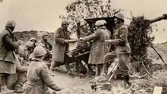 The M1934/39 was initially produced and tested in Italy as a possible replacement for the Italian military's World War I era Adrian helmets. The helmet did not meet their standards however, and they were sold to Greece as bare shells just before the outbreak of World War II. Once the Greeks received the M1934/39's they painted them green and added their own liners and chin straps.[2] These liners were made from leather and featured seven 'tongues'. One of the 'tongues' was marked with a crown and the words ΕΛΛΗΝΙΚΟΣ ΣΤΡΑΤΟΣ ("Greek Army"). Due to the sudden onset of hostilities between Greece and Italy, Greece did not receive the total number of helmets ordered and as a result, was unable to equip their entire army with the M1934/39.[3]
