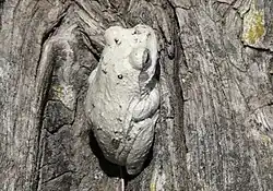 Individual frogs can change their color from chalky white to dark brown, with the brown coloration presenting in a geometric/bark pattern. These frogs change their skin colors in response to temperature differences in order to maintain body temperature and minimize evaporative water loss. When they adopt a darker coloration, their body temperature will warm more rapidly with the sun's radiation. It is common for frogs to do this when the air temperature is below 36 °C. White coloration helps them maintain a temperature below the ambient temperature by reflecting heat away.[11] Their skin is resistant to evaporation that rivals terrestrial reptiles, earning them the nickname of "waterproof frogs", but this resistance is not present in their ventral skin. When met with a dry period, these frogs tuck their ventral areas under them so that only their resistant skin is exposed. They also secrete a water-resistant mucus to seal any small gaps when they aestivate.[12][13] If disturbed and forced to move, they lose a significant amount of water and may not be able to survive the rest of the dry season.[12]