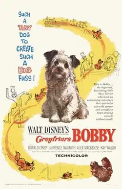 Greyfriars Bobby is a 1961 American drama film starring Donald Crisp and Laurence Naismith in a story about two Scottish men who compete for the affection of a Skye Terrier named Bobby.[2] The screenplay by Robert Westerby was based upon the 1912 novel Greyfriars Bobby by Eleanor Atkinson which was based, in turn, upon an incident in 19th century Edinburgh involving a Skye Terrier that came to be known as Greyfriars Bobby.[3][4] It was the second film based upon Atkinson's novel, the first being Challenge to Lassie in which Crisp also starred.[5] The film was directed by Don Chaffey and shot at Shepperton Studios and on location in Scotland.[6][2] The film has been released to DVD[7] and Disney+.