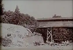 This arduous crossing of the creek was eliminated with the construction of a covered wooden bridge at the point where the road continued past the mill. The wooden bridge was replaced in 1924 by a 600-ton steel span.