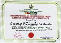 3. ^ "Grundtvig Intl Secondary SCHL wins Presidential award, as overall best private SCHL in Nigeria". 13 October 2020.