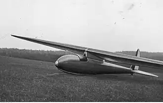 It was an all-wood, single-seat, high wing aircraft. Its wing was in two parts, rectangular in span inboard but trapezoidal over most of the span. Each part was built around a single spar with plywood covering from it forwards around the leading edge forming a torsion-resistant D-box. Behind the spar the wings were fabric-covered. They were connected together centrally on a streamlined fuselage pylon.[1] The ailerons, also fabric-covered, operated differentially.[2]