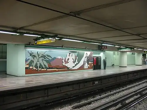 The station logo depicts the bust of Vicente Guerrero (1782–1831), a national hero who participated in the Mexican War of Independence.[2][3][4] The name of this station refers to the neighbourhood which it serves. The station was opened on 20 November 1970 with service along Line 3.[5] Service along Line B started on 15 December 1999.[5] Guerrero has facilities for the handicapped and a cultural display.[2]