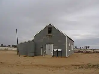 During the period January 1881 to June 1884 Protestant services were conducted in the Gunbar Hotel by the Presbyterian minister, Samuel A. Hamilton (based at Hay), for which service the congregation subscribed £50 per annum. A church was constructed and opened in July 1884 at the site of the surveyed village (north of the original settlement) where it stood until 1914, when it was taken down in sections by a contractor from Hay and re-located to an elevated location near Gunbar village. The Presbyterian church was re-opened at its new location in June 1914.[13]