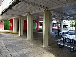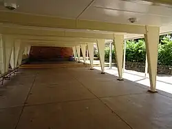 The school also gained a classroom block for Intermediate students (in 2018 named Block D), east of the northern end of Block C.[82] The first section of Block D, constructed after May 1958 and occupied in 1959, included four classrooms on the first floor, each with double doors to the northern verandah, which had a metal-sheeted balustrade and a separate roof with clerestory windows above. The west end of the building was brick. The understorey contained an open play area, under open web steel trusses which were supported on lozenge shaped concrete columns.[83][84][85] Three more classrooms were added to the east end of Block D after November 1958, while a brick Boys toilet block, with lockers and showers, was added at the west end of the understorey.[86][87] By 1982, a passageway had replaced part of the second classroom from the east end.[88][1]